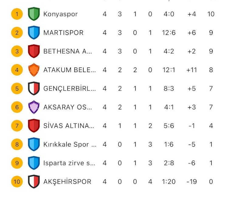 Turnuvanın ilk günü yapılan maçlarda ki puan durumu sıralaması ise şu şekilde:
